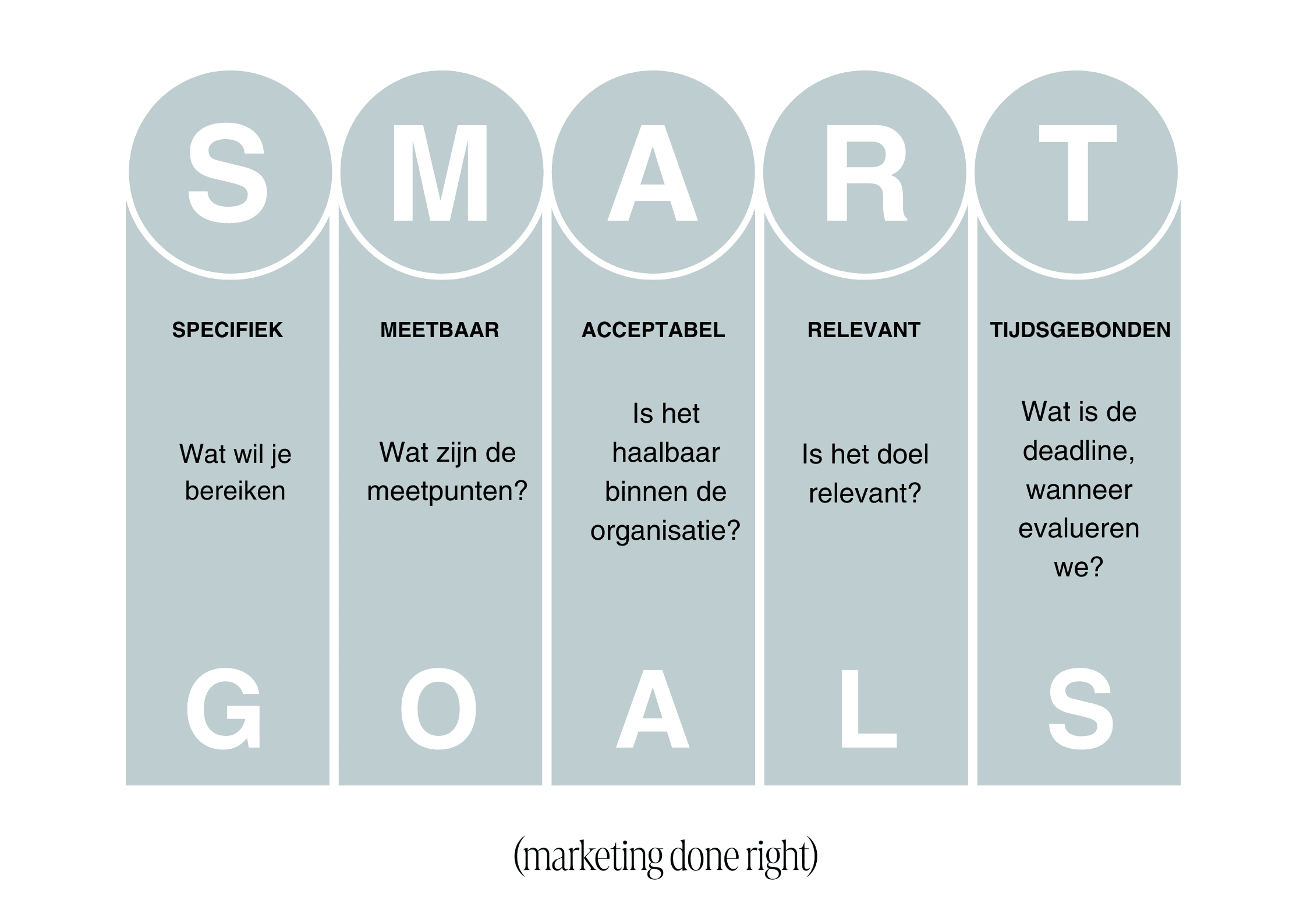 Specifiek: wat wil je precies bereiken? Meetbaar: wat zijn de meetpunten? Acceptabel: is het haalbaar binnen de organisatie? Relevant: is het doel relevant? Tijdsgebonden: wanneer moet het bereikt worden? Zodra we onze doelstellingen geïdentificeerd hebben, kan het marketing departement een gericht plan opstellen om deze te realiseren.